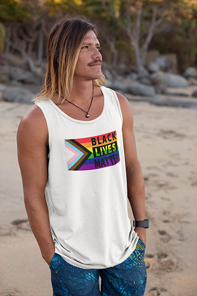As the Rainbow Flag becomes more inclusive, We the People Clothing, want to show our support for Black Lives Matter. Highlighting the new flag, with a bold proclamation that Black Lives Matter. We the People Clothing will donate $5.00 from each sale to Black Lives Matter. We want to show the support from a LGBTQ company. The thought and design of this shirt was from Drummondculture. Check out his you tube channel Becoming an Ally at https://youtu.be/DfUy0nBUO74 100% Cotton, White Unisex Tank Top. Sizes S-3XL NIce comfortable fit.