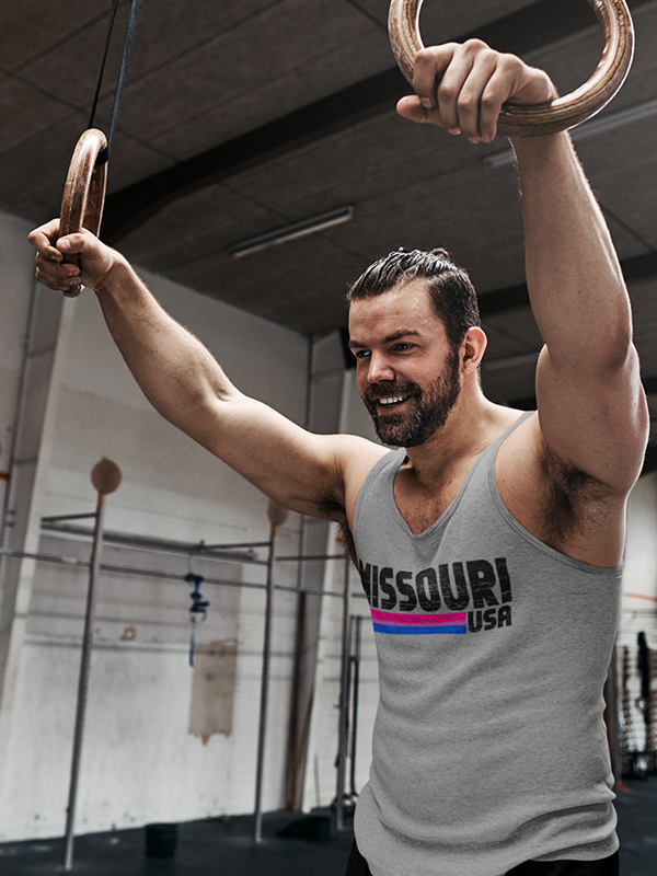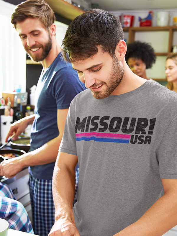 Simple to the point, Missouri Bi-sexual T-shirt, in what is traditionally a more feminine cut. Heather Grey 90/10 S-3XL Soft, Fit is really good, pre-shrunk, buy the size you normally wear.