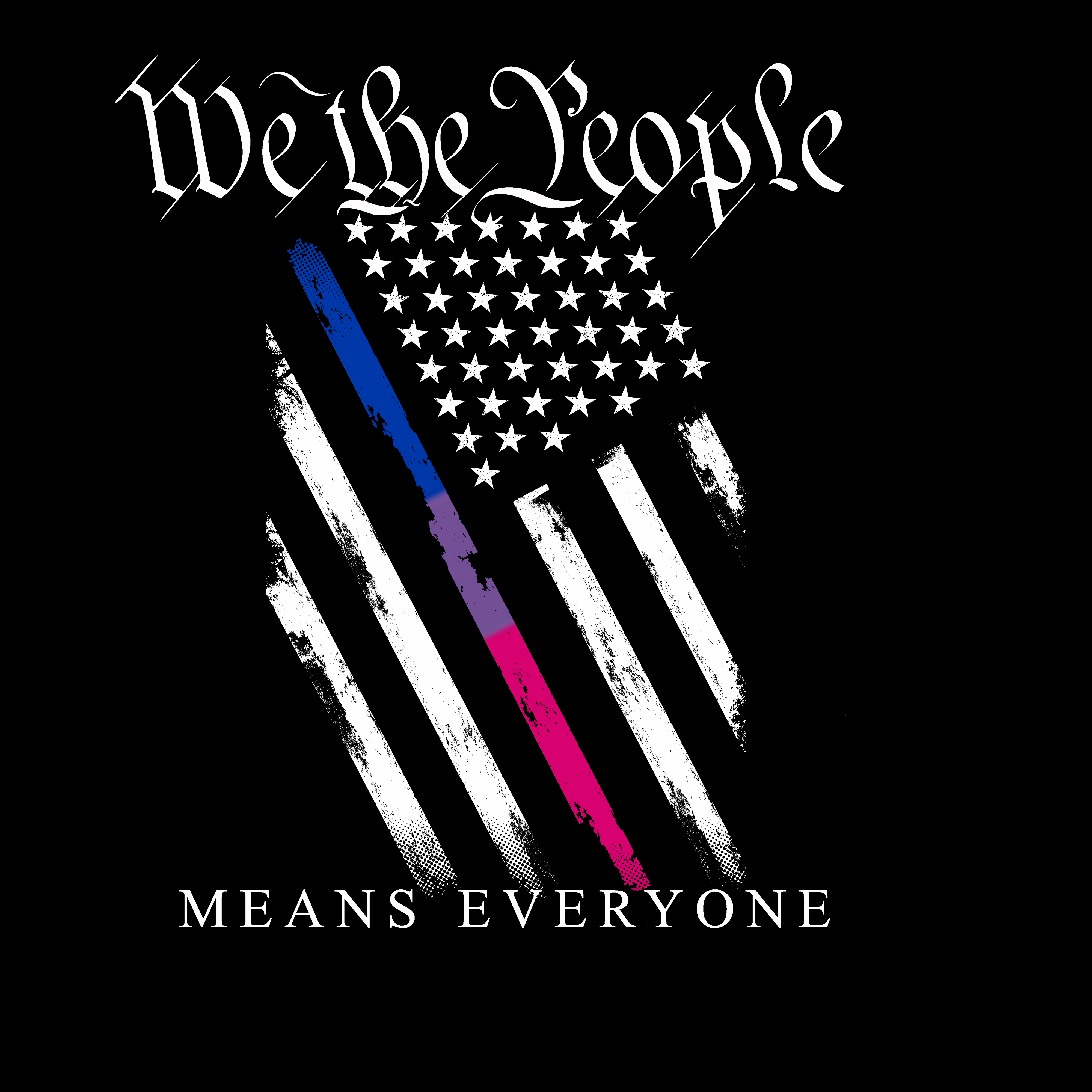 We the People, Means Everyone. This is one of the newer versions of this design that we have come up with. This one is with the bi-sexual flag colors, we also have it in rainbow colors. 100% cotton black unisex t-shirt, S-5XL
