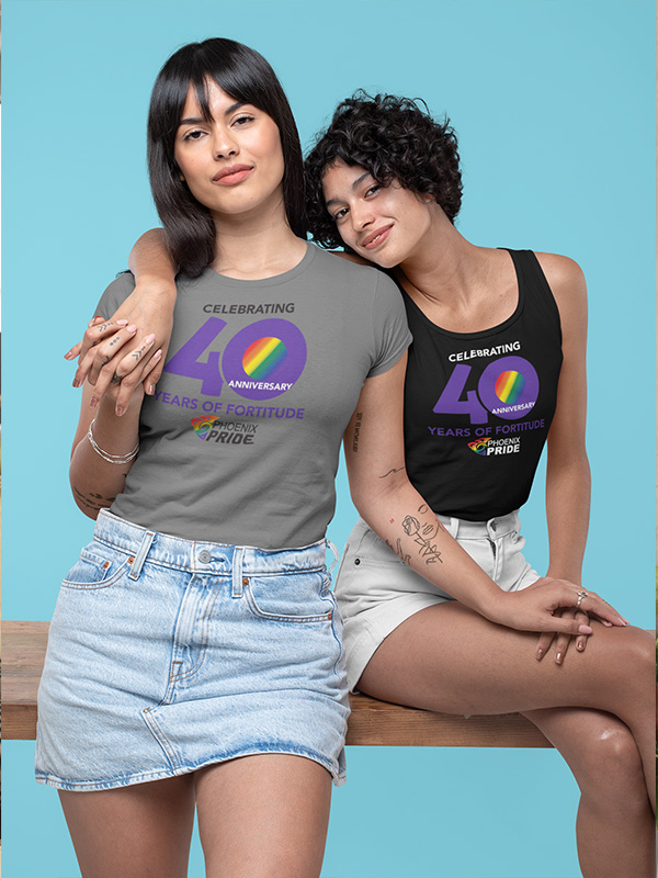 40 Years of Fortitude, and going on for 40 more, Celebrate this year with us in Phoenix, for the 40th Anniversary of Phoenix Pride. Lets start the 20's with a new roaring 20's. This Black 100% Cotton traditionally a more feminine cut Racerback Tank top with the 40th anniversary logo beautifully printed on the shirt. Small-3XL, remember it is cotton, and will shrink a bit,