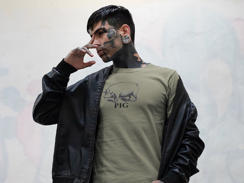 There is a little bit of a pig in all of us, I have to explain this one the most of all of our shirts. I you want me to tell you what I think this means send me a message. A Khaki Brown, sand, colored 100% cotton, pre-shrunk T-shirt.