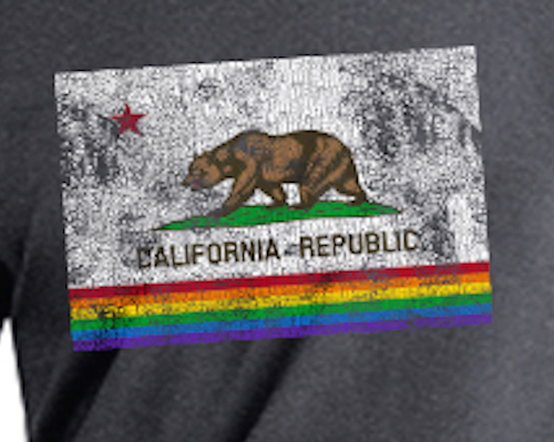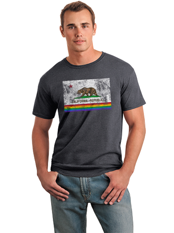 Bringing Rainbow to the California Flag, I love this shirt, Distressed, and looking like your most comfortable shirt you have ever owned. This Dark Heather Grey shirt is 50/50 Cotton/Polyester. Sizes up to 4XL. Comfortable fit, Nice sizing.