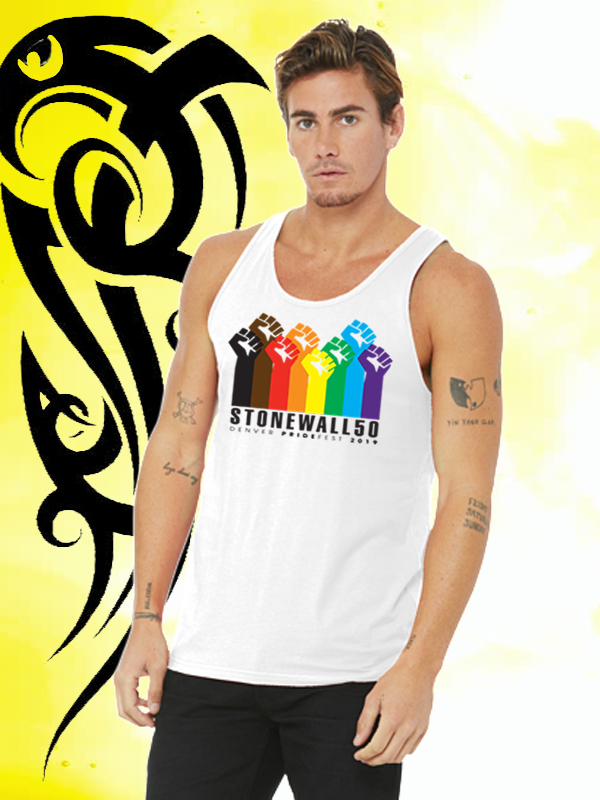 Show your guns, in this classic look, This Tank Top, which celebrates the 50th Anniversary of the Stonewall Riots, White, 100% Cotton, Join us at Denver Pride always on the 3rd weekend in June. Available in Sizes Small -XXLarge. These will ship the last week of May to the first of June.