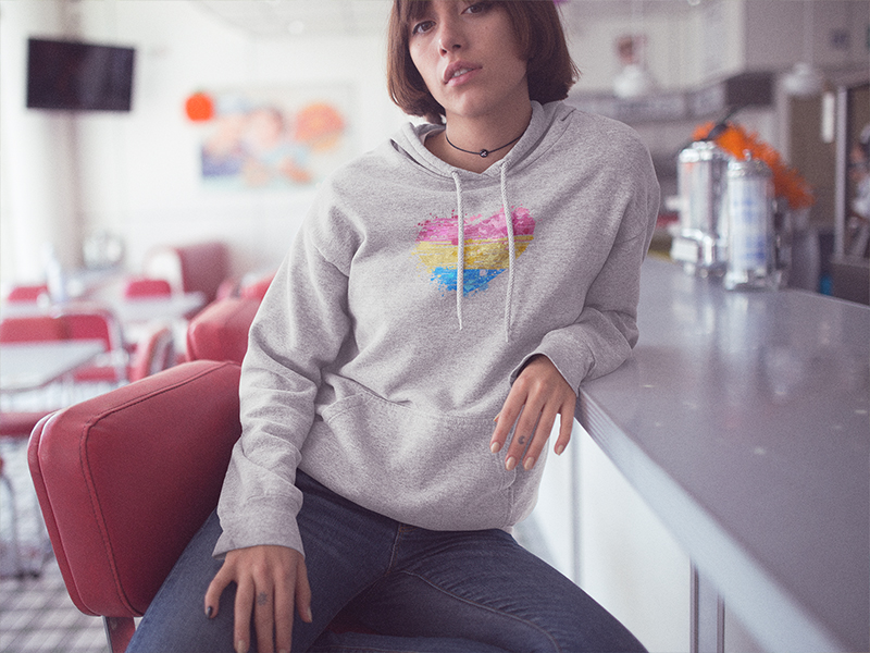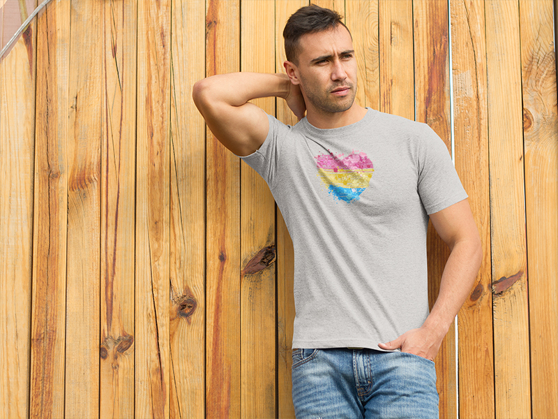 A heart that loves regardless of gender, That is a big heart, we want to show that love with this design. An idealized heart full of love in the Pansexual flag colors. Here we have it on an Athletic Grey 100% Cotton traditionally feminine T-shirt sizes, S-2XL