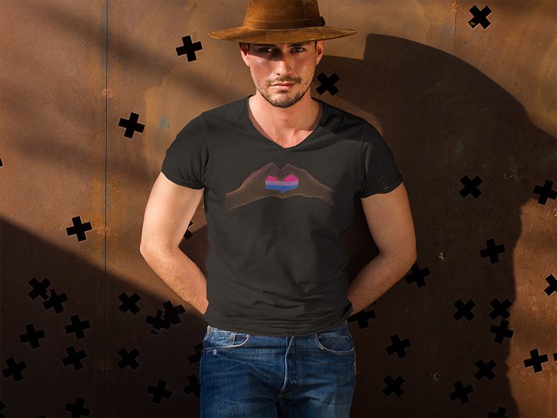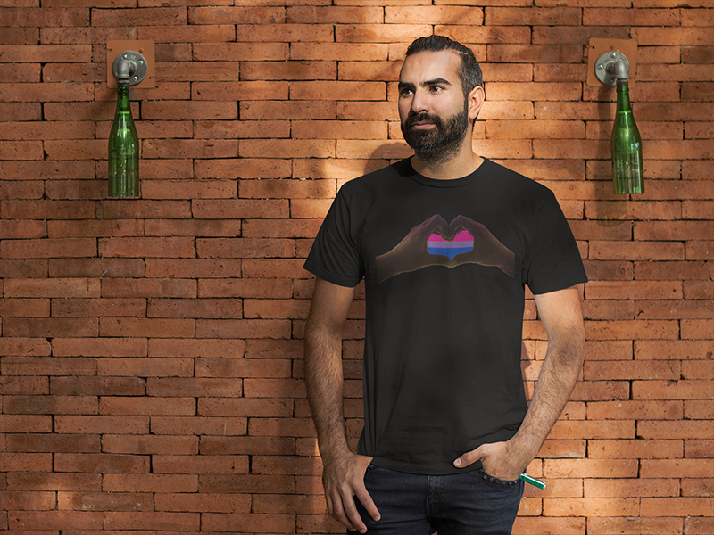 I did not know what to call this one, Finger Hands? Hand Heart? Finger Heart? They all sound a bit naughty to me, but you see the design, So Shadow heart, with the bi-flag in the background, on this black 100% baseball style jersey, with white contrasting 3/4 length sleeves. Xsmall through 2XL.