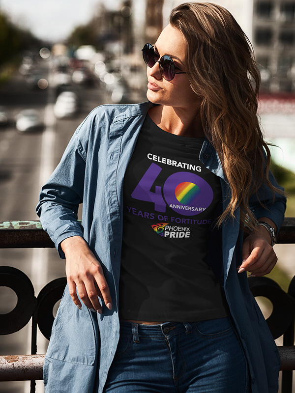 40 Years of Fortitude, and going on for 40 more, Celebrate this year with us in Phoenix, for the 40th Anniversary of Phoenix Pride. Lets start the 20's with a new roaring 20's. This Crew neck t-shirt is 100% Cotton, A traditionally more feminine cut black t-shirt with the 40th anniversary logo beautifully printed on the shirt. Small-3XL, remember it is cotton, and will shrink a bit,