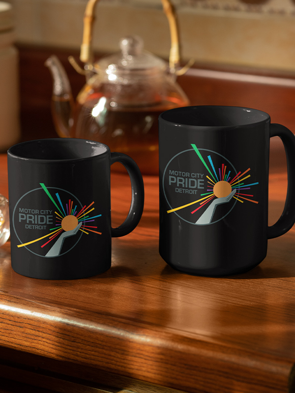 Motor City Pride logo, on either 11 ounce or 15 ounce mug. These porcelian mugs come in 2 sizes 11 ounce and 15 ounce