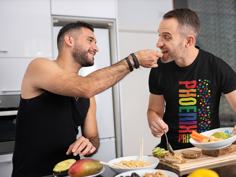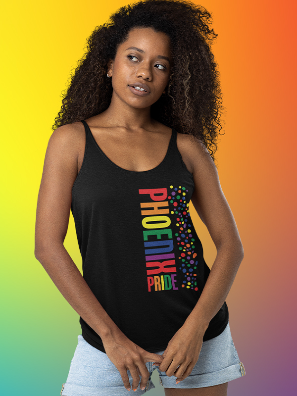 Isn't this a great logo, Phoenix Pride, rainbow dots, Black T-shirt in a more traditional feminine cut, Sizes XS-through 3XL 100% Cotton Size XS is a unisex sizing