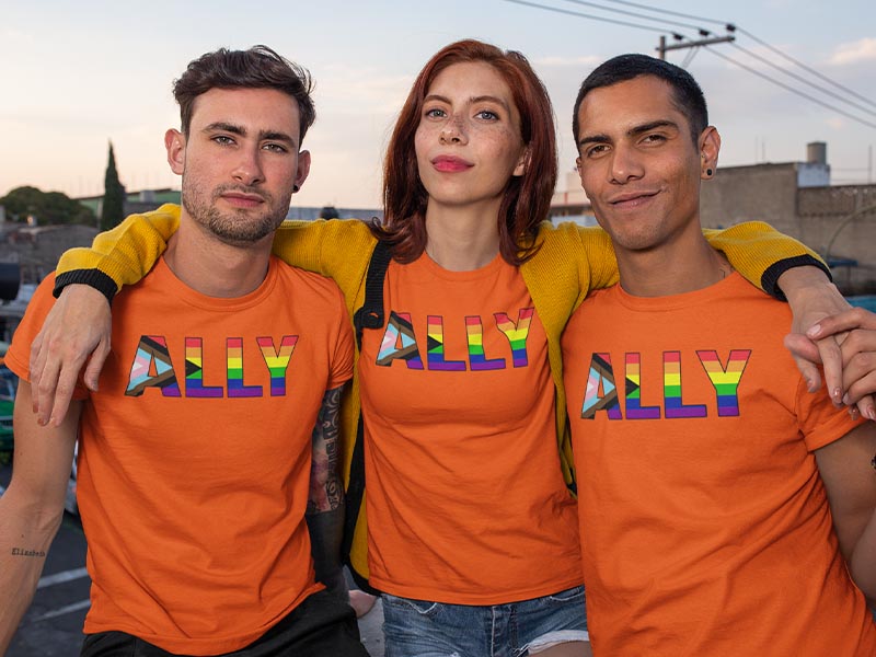 Allies do not care how we identify, just that we are true to ourselves, Allies are a very important part of our lives, being our family, or our chosen family, Heather Orange 90/10 Unisex T-shirt. S-4XL Soft, Fit is really good, pre-shrunk, buy the size you normally wear.