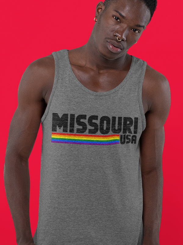 Simple to the point, Missouri Rainbow T-shirt, in what is traditionally a more feminine cut. Heather Grey 90/10 S-3XL Soft, Fit is really good, pre-shrunk, buy the size you normally wear.
